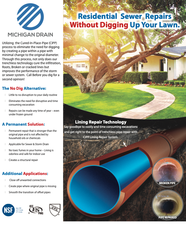 Michigan Drain is now a certified installer of Light Ray's LR3 UV Cured in Place Trenchless Pipe Repairs.